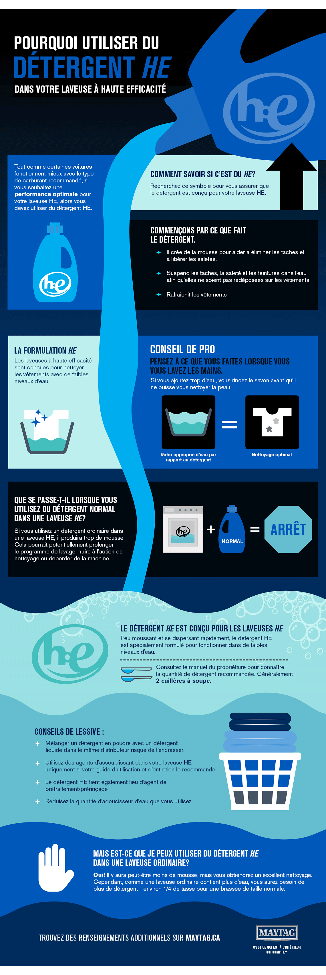Si vous possédez une laveuse haute efficacité, alors vous savez sans doute que vous devez utiliser du détergent HE à chaque brassée. Pourquoi? Et comment? Apprenez-en plus sur l’utilisation du détergent HE pour des résultats optimaux dans notre infographique rapide! Et même si votre laveuse actuelle n’a pas besoin de détergent HE, vous pouvez quand même l’utiliser.