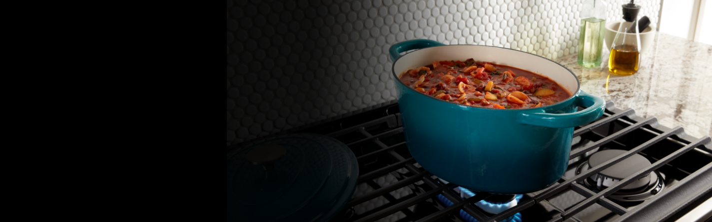It is safe to use a Dutch oven on a gas or electric stovetop to simmer, sear or braise. You can try cooking meats with a stovetop setting like the Power™ Burner available on select Maytag® Gas Cooktops. This feature helps sear meats while sealing in the juices before easily transferring the pot to the oven to slowly cook until it’s ready.