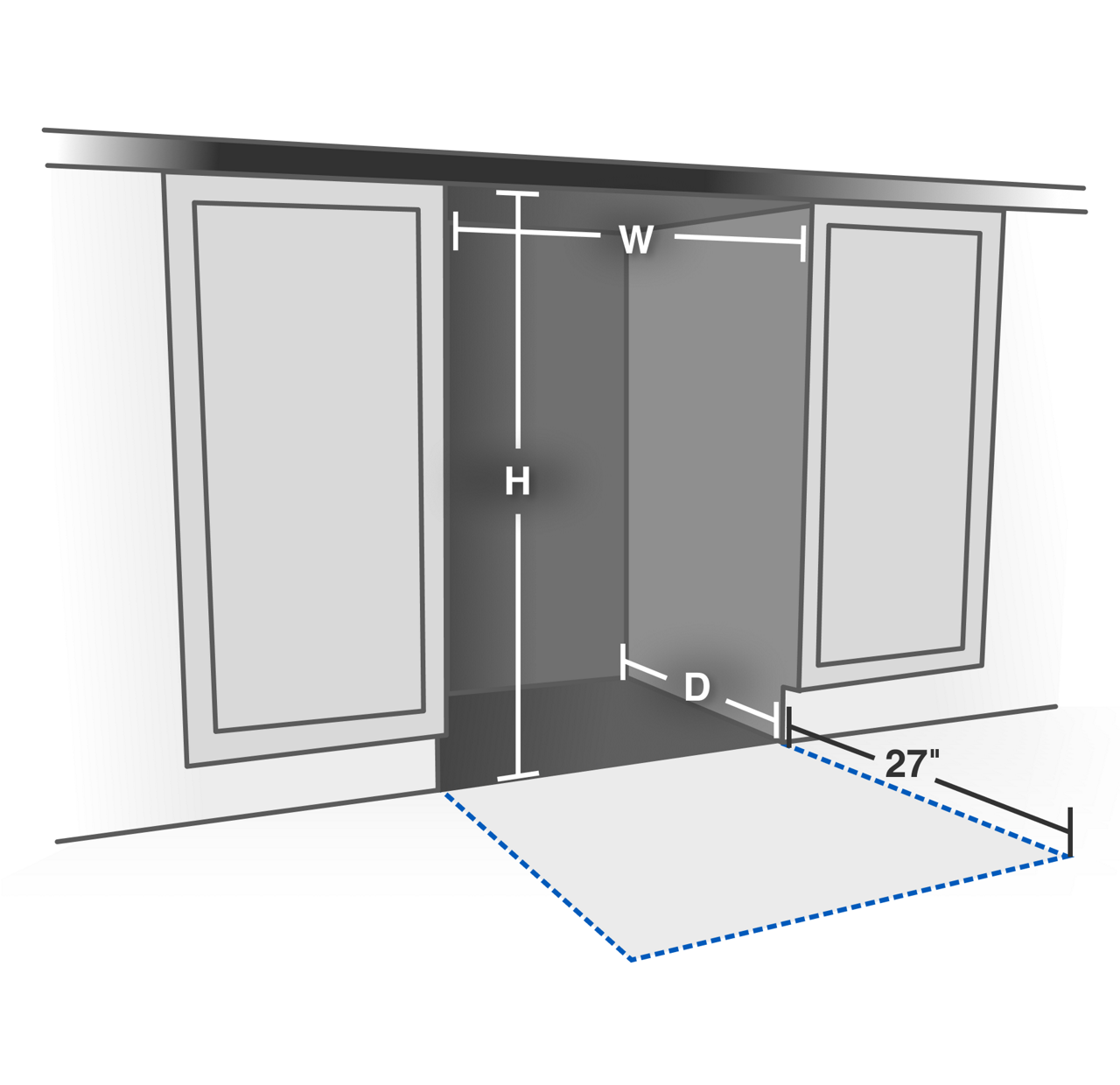 Depth (D) - Measure from the back of the opening to the front of the cabinets. Keep in mind the dishwasher door will extend past the cabinets. Make sure there is at least 27 inches of open space in front of the dishwasher for loading and unloading.